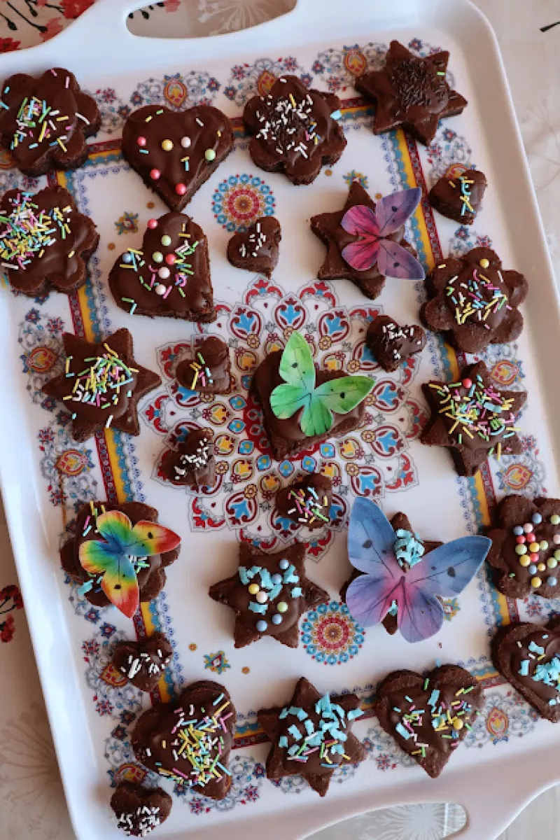 Taki placek czekoladowy, to nie tylko pyszny wypiek, ale również niezła frajda dla dzieci. Placek nadaje się idealnie do wykrawania takich kształtów jak serca, gwiazdy, czy kwiaty. Próbowaliśmy również wykrawać koty i bardziej fantazyjne kształty, ale często uszkodzeniu ulegały części takie jak ogon kota, czy też uszy królika. Tak przygotowane kształty polałam polewą czekoladową i syn udekorował je dekoracjami cukierniczymi. Można oczywiście sięgnąć po bardziej wymyślne, tj. kawałki owoców, k...