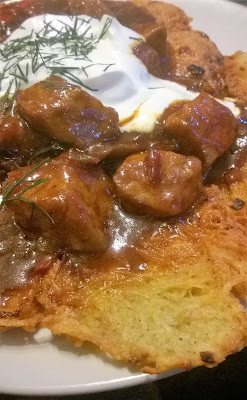 Placki ziemniaczane są na pewno znane wam wszystkim ;) Każdy lubi je w innej formie, jedni z dodatkiem soli i niczego więcej, inni z różnej maści sosami a jeszcze inni... z cukrem :) Moja wersja placek po węgiersku to placek ziemniaczany z mięsnym sosem i dodatkiem śmietany. Jest aromatyczny, chrupiący i niezwykle syty! Składniki: 5 ziemniaków 2 duże cebule 1 jajko 4 łyżki mąki olej 300 g mięsa wieprzowego na gulasz 1 papryka czerwona woda 2 kromki chleba razowego gęsta śmietana 18 % koperek ...