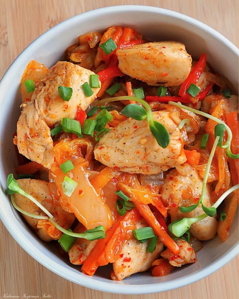 Kimchi to tradycyjne danie kuchni koreańskiej składające się z kiszonych warzyw, najczęściej kapusty pekińskiej, ogórka lub rzodkwi. Jest niezwykle zdrowe, zawiera mnóstwo witamin, żelaza, błonnika oraz bakterii kwasu mlekowego, które korzystnie wpływają na jelita. Ma właściwości przeciwzapalne i stymulujące układ odpornościowy. Dzisiaj zapraszam Was na połączenie ostrego kimchi, warzyw oraz delikatnych polędwiczek z kurczaka. Danie dostarcza niesamowitych doznań dzięki finezyjnemu połączeniu...