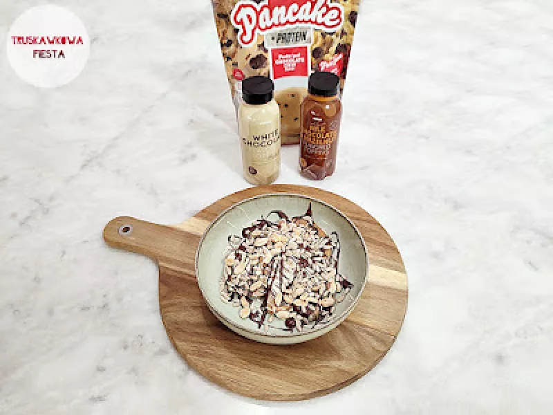 Proteinowe naleśniki owsiane z białkiem, toppingiem o smaku czekolady mlecznej, orzechów laskowych i białej czekolady od Prozis oraz orzeszkami ziemnymi i nasionami słonecznika.Składniki:25 g proteinowych naleśników owsianych z białkiem + 75 ml wody lub mleka25 g toppingu o smaku czekolady mlecznej, orzechów laskowych25 g toppingu o smaku białej czekolady10 g orzeszków ziemnych10 g nasion słonecznikaSposób przygotowania:W misce z woda lub mlekiem wymieszać mieszankę na naleśniki. Smażyć na pa...