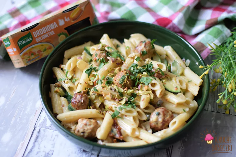 Dzień dobry :-) Grudzień to zabiegany miesiąc, więc u nas królują obiady na szybko. Tym razem makaron z pulpecikami, cukinią, suszonymi pomidorami, pistacjami i to wszystko w sosie serowym. Składniki na 4 porcje:500 g mięsa mielonego z szynki300 g makaronu rurki1 cukinia6 sztuk suszonych pomidorów1/2 szklanki posiekanych pistacjicebulasólpieprzświeża natka pietruszki1 bulionetka drobiowa Knorr1/2 szklanki śmietanki 30%3/4 szklanki startego sera u nas Gouda1 jajko1. Mięso mielone łączymy z j...