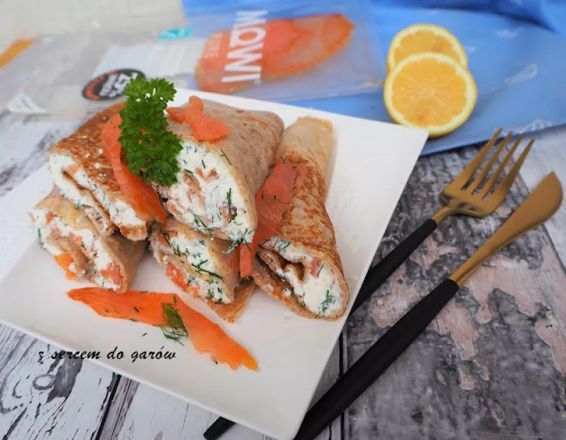 Razowe naleśniki z wędzonym łososiem