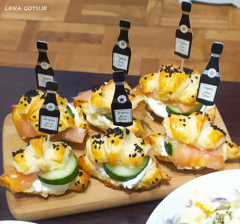 Idealna przekąska na raz na imprezę sylwestrową i nie tylko.Szybka i łatwa w przygotowaniu, wygląda bardzo elegancko i pysznie smakuje! Składniki:1 opakowanie ciasta francuskiego,opakowanie sera kanapkowego śmietankowego,około 80 g łososia wędzonego w plastrach,kilka plasterków ogórka zielonego,jajko,czarnuszka Przygotowanie:Ciasto francuskie dzielimy na pół wzdłyż dłuższej krawędzi, następnie dzielimy na 6 kwadratów i każdy na pół tworząc trójkąt. Zwijamy jak na rogale.Smarujemy roztrzepan...