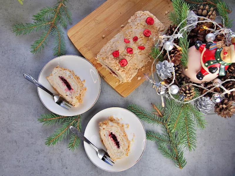 Rolada bezowa z kremem piernikowym i malinową konfiturą