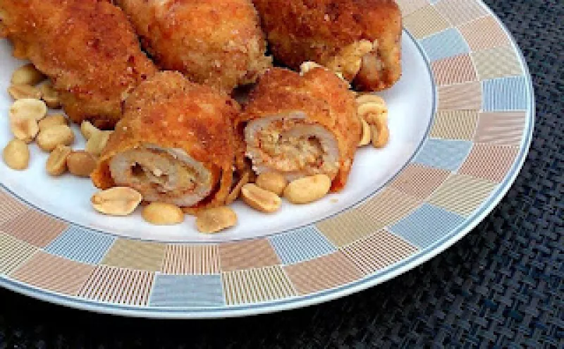 Czasami szukamy nowych smaków, inspiracji, ciekawych połączeń. Uwielbiamy tradycyjne potrawy, jednak od czasu do czasu lubimy zaszaleć :) Taka jest właśnie ta potrawa. Z jednej strony schab, tradycyjne roladki, nawet chrzan niczym specjalnym się tutaj nie wyróżnia. Wystarczyło jednak dodać tylko orzeszki ziemne, umiejętnie to połączyć i "ta da". Roladki smakują przepysznie na ciepło jak i na zimno. Ja jednak uwielbiam je właśnie na ciepło. Aromat chrzanu unoszący się nad mięsem, farsz wypływa...