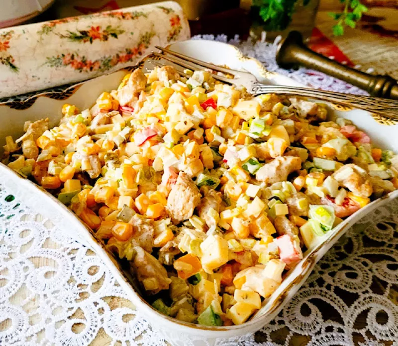 Doskonała sałatka na wszelkiego rodzaju imprezy. Niewiele składników plus sos majonezowy i sałatka gotowa. Możemy ją przygotować szybciutko, dzień wcześniej ponieważ sałatka lubi postać w lodówce i przegryźć się lub dojrzeć (jak kto woli). U nas od lat „balanga” króluje w Sylwestra i karnawale, który rozpoczyna się od Trzech Króli. To jest sałatka z tych znikających ze stołu jako pierwsze.Składniki:20 dkg sera żółtego w kawałku1 puszka kukurydzy2 papryki kolorowe2 piersi z kurczaka4 ogórki ko...