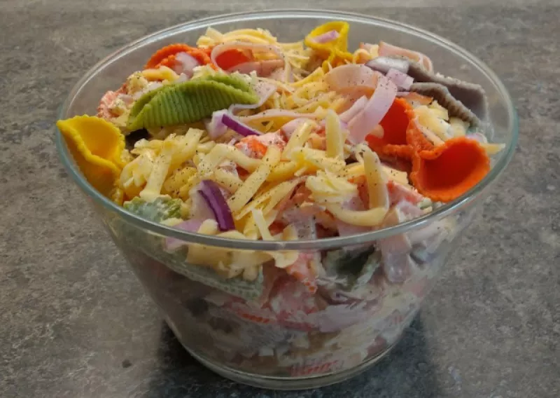 Pyszna sałatka makaronowa, która na pewno zaspokoi podniebienie wielu smakoszy. -- Skład : makaron op.250 g, szynka lub polędwica w plastrach op. ~150 g, ser żółty w kawałku np. pół serka Liliput ~175 g , cała lub połowa czerwonej cebuli, 4-5 jajek ugotowanych na twardo, sól i pieprz do smaku- po dużej męskiej szczypcie i 3 duże stołowe łyżki majonezu. ***opcjonalnie zrób sobie ( jak nie masz) majonez domowy link do przepisu .../majonez-domowy-w-10-sekund.html ... Wędlinę kroimy w paski lub...