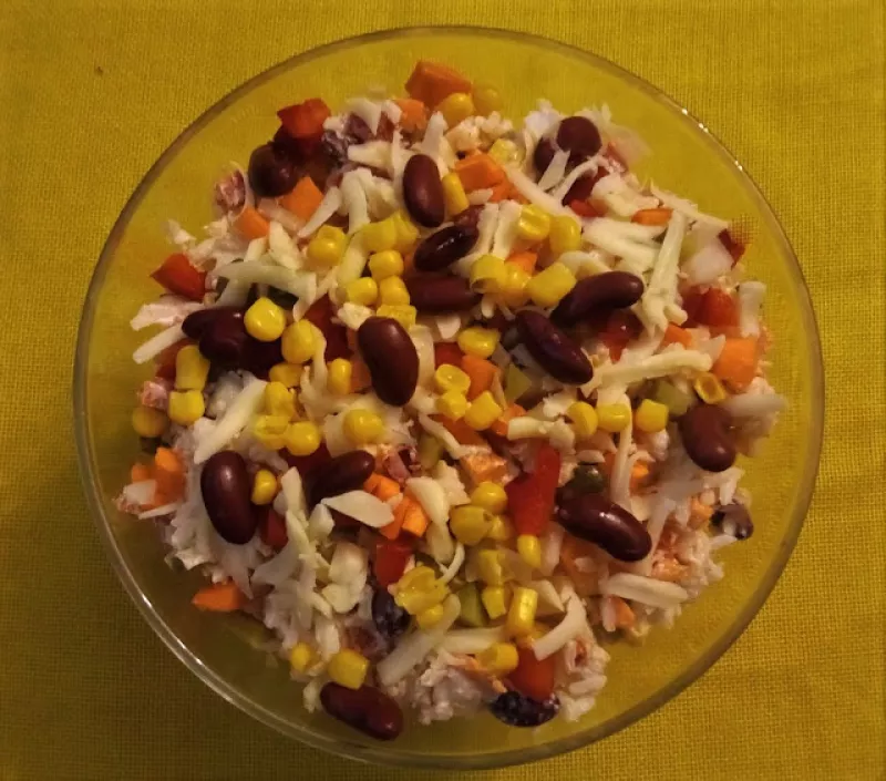 Sałatka ryżowa z różnymi dodatkami, dla smakoszy sałatek:) --SKŁAD: 300g ryżu, b.duża czerwona papryka, duża cebula, 2 marchewki, 250gczerwonej fasoli, 220g kukurydzy,3 duże korniszony, 200-250g sera żółtego, do przyprawienia sól i pieprz, a dla połączenia wszystkiego 5 łyżek majonezu. *** 300 g ryżu po gotowaniu- 750g, waga fasoli i kukurydzy po odsączeniu... Ryż gotujemy na sypko i studzimy, paprykę-cebulę-ogórki-marchewkę kroimy w kostkę , fasolę i kukurydzę płuczemy w b.zimnej wodzie-od...