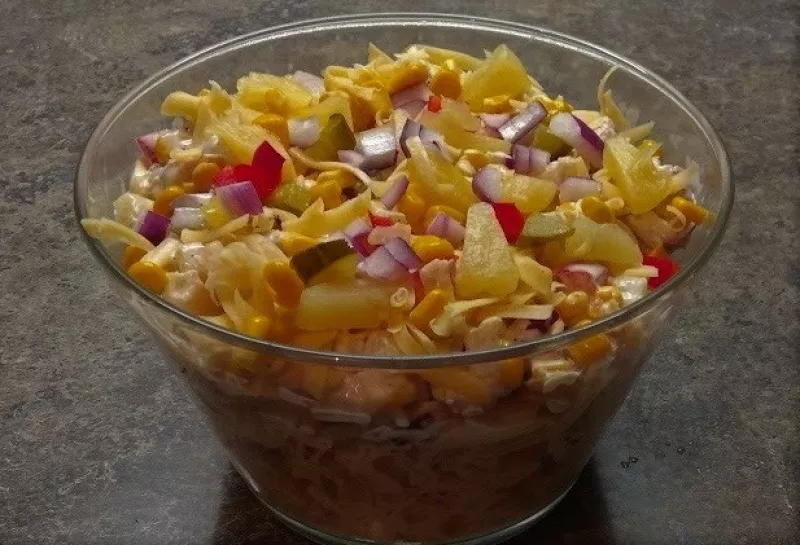 Sałatka dobra na każdą okazję, a kto raz skosztuje będzie wracał zawsze... -- Skład: piersi z kurczaka z rożna pokrojone w kostkę (lub ugotowane), puszka pokrojonego ananasa ~300-350 g, puszka kukurydzy 285-320 g, żółty ser 125-160 g utarty na grubych oczkach tarki, czerwona cebula pokrojona w kostkę (sparzona lub nie...) sól i pieprz do smaku. Opcjonalnie ogórek korniszon, kawałek pokrojonej w kostkę kolorowej paryki lub inne ulubione warzywo. Dla połączenia smaków: majonez 4 łyżki lub dobr...