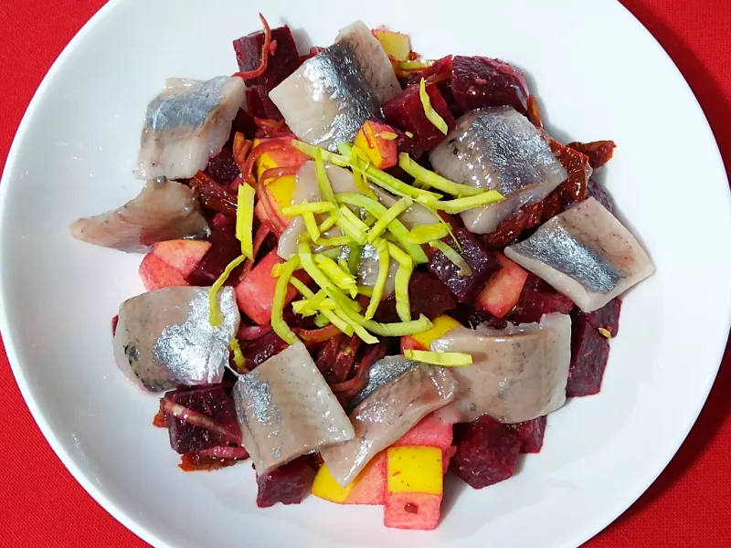 Źródło: https://www.kulinarnapokusa.pl/salatka-z-holenderskiego-matjasa-na-buraczkach