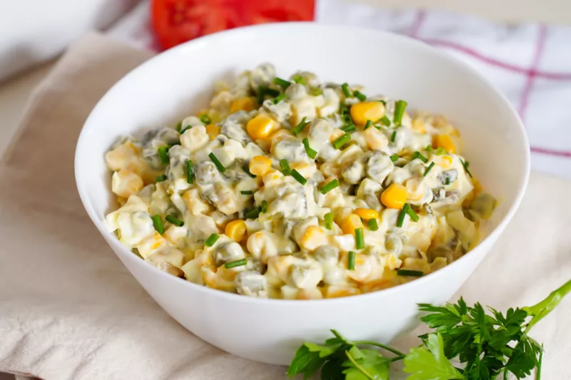 Sałatka z jajkiem, groszkiem i kukurydzą