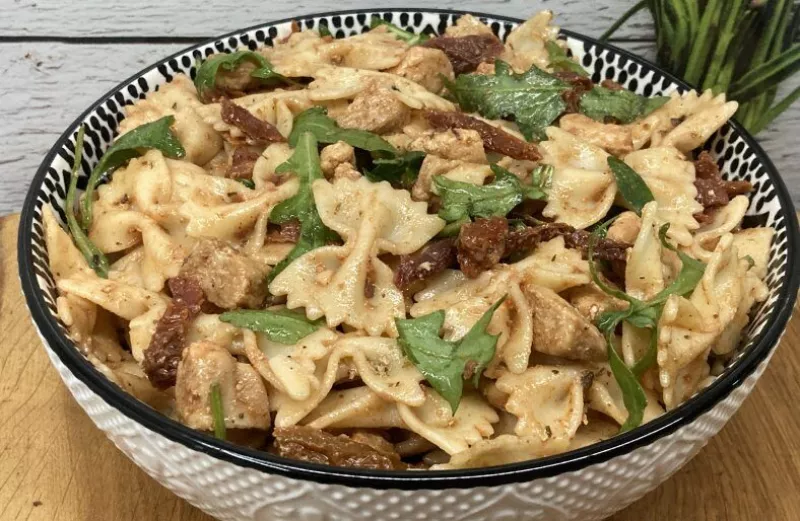 Ta sałatka z makaronem kokardki, soczystym kurczakiem i aromatycznymi suszonymi pomidorami to sycące, a jednocześnie lekkie danie. Rukola dodaje świeżości i delikatnej goryczki, a wyrazisty dressing na bazie zalewy z pomidorów, ketchupu i musztardy idealnie łączy wszystkie smaki. Doskonała na lunch, kolację lub jako danie na spotkania rodzinne. SkładnikiSkładniki 250 g makaronu kokardki 2 filety z kurczaka 8–10 suszonych pomidorów Garść rukoli Olej do smażenia Przyprawa do kurczaka Dressing: ...
