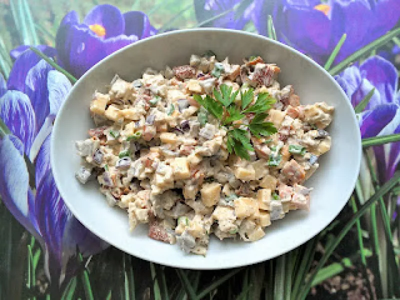 Sałatka z mięsem i warzywami z rosołu z żółtym serem i suszonymi pomidorami