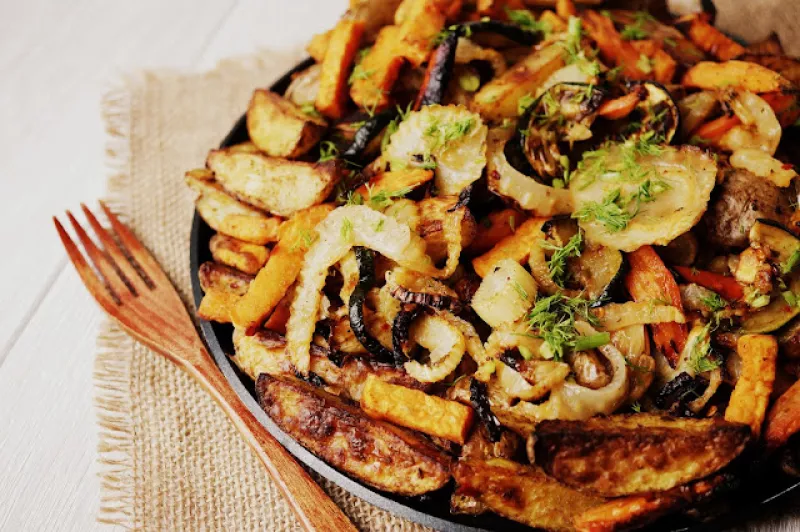 Warzywa upieczone w piekarniku lub grillowane smakują zupełnie inaczej. Podczas pieczenia wydobywa się z nich naturalna słodycz i aromat, a co najważniejsze, nie tracą witamin. Bardzo smaczna i pełna aromatów sałatka, która świetnie sprawdzi się jako dodatek do dań obiadowych. ~Składniki~ 2 duże marchewki 1 mały batat 4 ziemniaka 1 fenkuł 1 mała cukinia 3-4 ząbka czosnku 1 łyżeczka płatków chilli 2 łyżeczki ziół prowansalskich 1 łyżeczka wędzonej papryki pimenton 0,5 łyżeczki mielonego kmink...