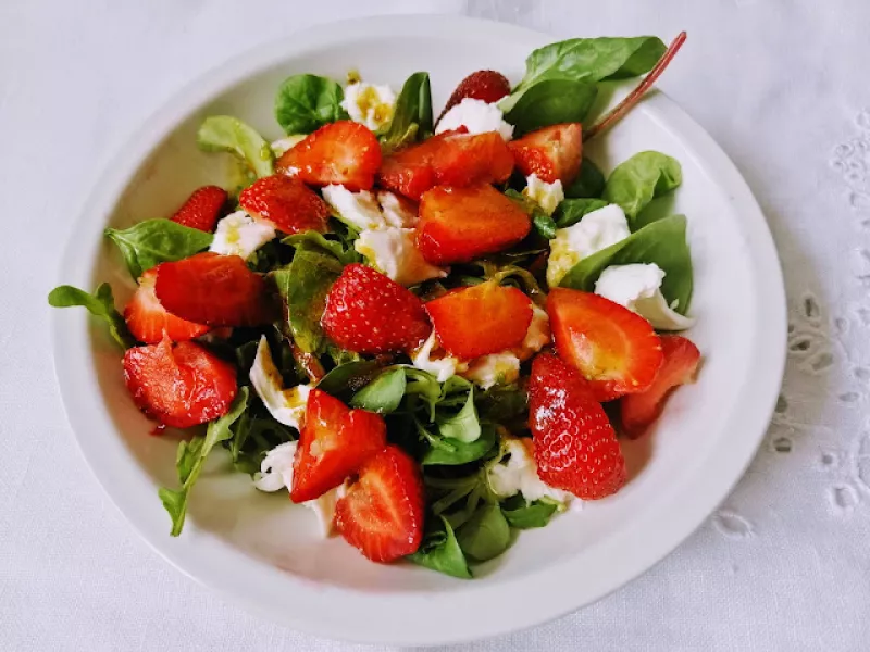 Sałatka z truskawkami, mozzarellą i mieszanką młodych liści - najlepiej smakuje w maju i czerwcuSałatka z truskawkami i mozzarellą to szybki sposób na orzeźwiające, lekkie danie. Łączy w sobie słodycz owoców, delikatność sera i świeżość młodych liści sałat. Idealnie sprawdzi się jako przystawka na letnie przyjęcie lub szybka przekąska w upalny dzień. Najlepiej smakuje w sezonie na truskawki, kiedy mamy dostęp do świeżych owoców z upraw gruntowych. Przygotowanie zajmie nam dosłownie kilka chwi...