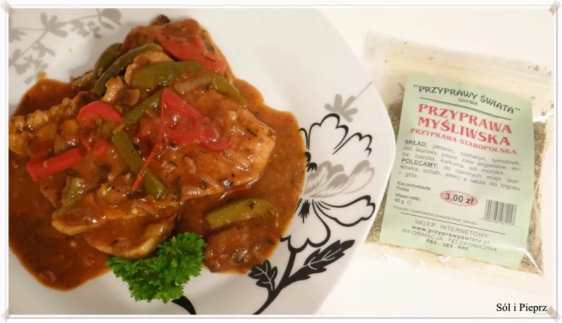 Inspiracją do tego przepisy były ostatnio zakupione genialne przyprawy ze sklepu "Przyprawy Świata". Schab delikatny, a sos bardzo aromatyczny, wykwintny, niecodzienny no i do tego lekkie kluseczki - obiad palce lizać. Składniki: 500 g schabu bez kości 200 g wędzonego boczku przyprawa myśliwska 2 cebule 1 papryka 200 g grzybów ( podgrzybki albo pieczarki) 4 ogórki konserwowe 2 łyżki koncentratu pomidorowego 2 łyżeczki musztardy 100 ml wody+ 3 łyżki mąki 1 litr wywaru jarzynowego słodka papry...