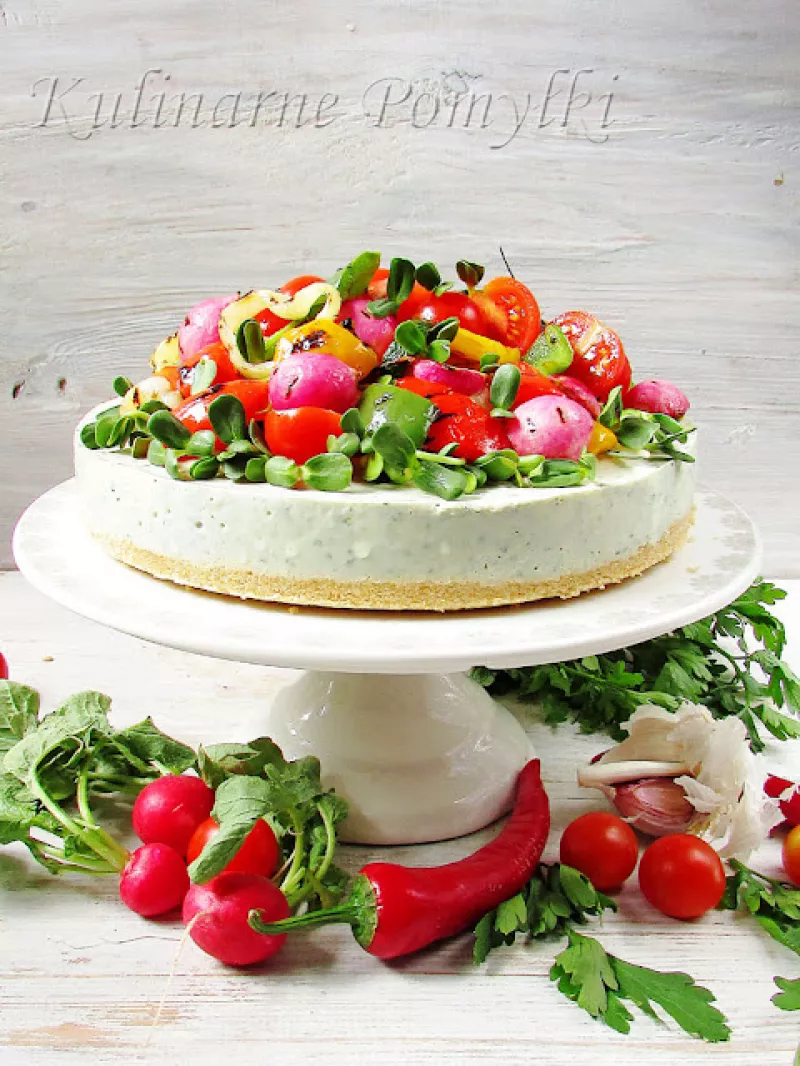 Idealny sernik wytrawny. Puszysty, delikatny o świeżym, bazyliowym smaku. Podany na chrupiącym, krakersowym spodzie. Razem z sałatką z grillowanych i kolorowych warzyw tworzą zgrany duet. Sernik idealny na letnią pogodę. Świetnie spisze się jako główne danie i przekąska. Składniki na spód: - 175 g słonych krakersów - 80 g stopionego masła - 20 g startego parmezanu Krakersy drobno pokruszyć np. w malakserze. Dodać roztopione masło oraz parmezan, wymieszać do otrzymania masy o konsystencji mok...