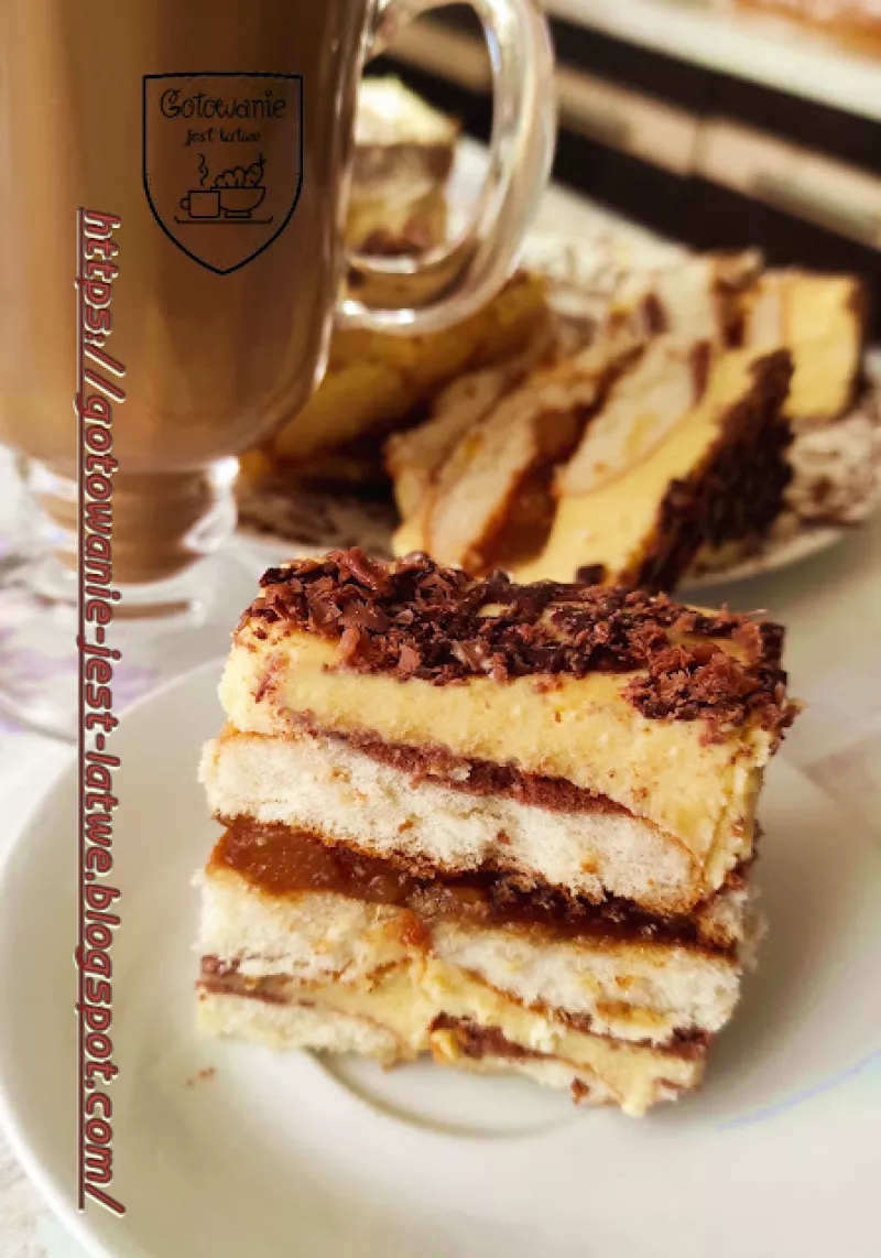 200 g masła200 g cukrucukier waniliowy1 kg twarogu ( z wiaderka) 4 jajka200 ml mleka2 budynie o smaku jabłek z cynamonemsok z połowy cytryny3 opakowania biszkoptówdżem jabłkowy lub gruszkowytabliczka czekoladyMasło i cukier podgrzewamy do rozpuszczenia, dodajemy twaróg, jajka i podgrzewamy ciągle mieszając. Budyń mieszamy z mlekiem i dodajemy do masy razem z sokiem z cytryny. Ciągle mieszając doprowadzamy do wrzenia . Gotujemy ok 3 min. Gorącą masą przekładamy biszkopty.Przygotowaną formę (t...