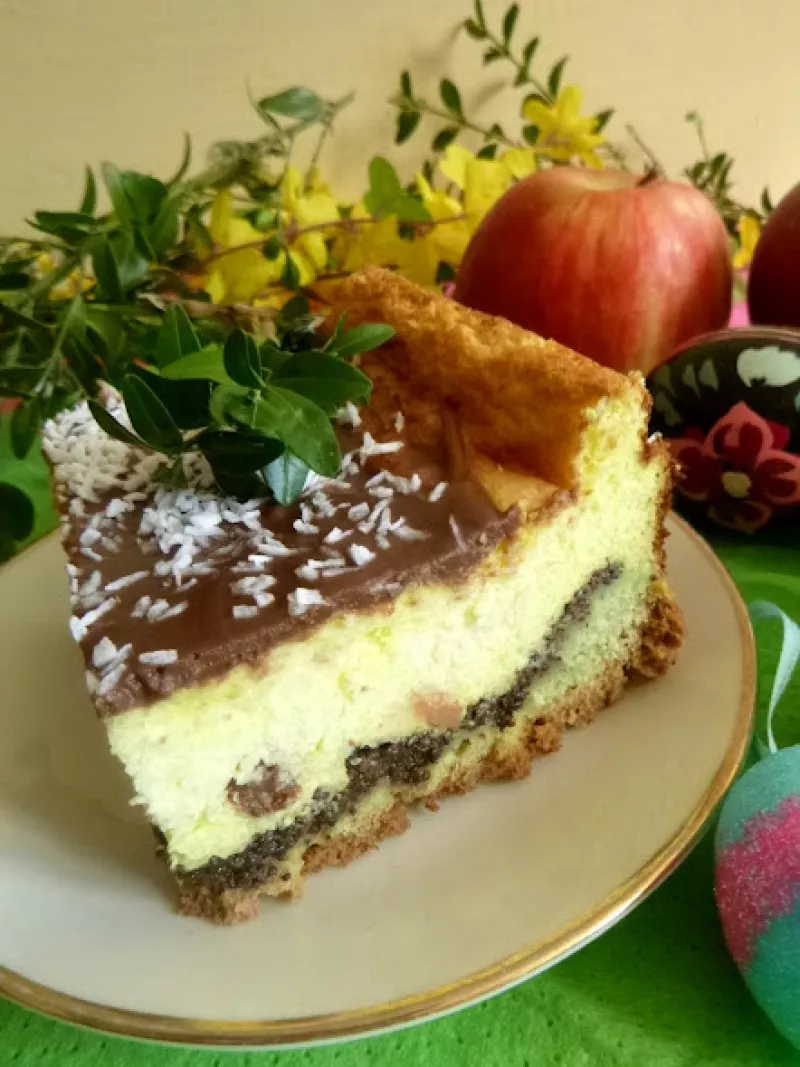 SERNIK WIELKANOCNYSkładniki: {16 porcji}CIASTO:2 szklanki mąki pszennej50 g cukru125 g margaryny 3 żółtek1 łyżki kakao1 łyżki proszku do pieczeniaMASA SEROWA:1 szklanka cukru1 kg sera {najlepiej ser w wiaderku}5 jajek50 g kaszki manny50 g małych rodzynek wymieszanych z łyżką mąki ziemniaczanej1 torebka cukru waniliowego {18g}MASA MAKOWA:50 dag masy makowej z puszki2 białkaPOLEWA100 g czekolady mlecznej2 łyżki masła2 łyżki mlekaOPRÓCZ TEGO:blaszka o wymiarach 29x31 cm papier do pieczenia2 ł...