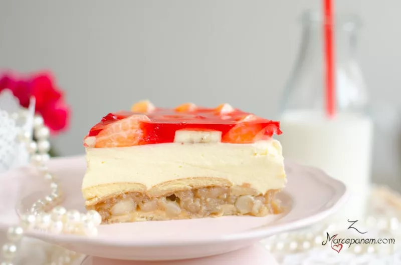 Sernik z galaretką, bez pieczenia, w wersji owocowej z uprażonymi jabłkami. Na wierzchu są owoce cytrusowe, ale można ułożyć każde inne jakie są pod ręką. SKŁADNIKI: 300 g jabłek 1 opakowanie okrągłych biszkoptów 2 galaretki owocowe 4 łyżki żelatyny 1 szklanka mleka 500 g kremowego serka waniliowego 1 jajko 2 żółtka 1/2 szklanki cukru 200 g masła owoce do dekoracji Na dno tortownicy wyłożyć biszkopty. Jabłka obrać, wykroić gniazda nasienne i pokroić w drobną kostkę. Włożyć do rondelka , nalać...