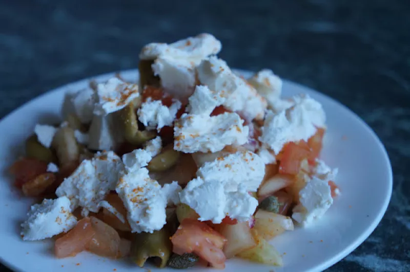 Składniki: 250 g ser sałatkowy półtłusty 1 mała cebula poł dużego pomidora 1 ogórek 22 oliwki 2-3 rzodkiewka cytryna przyprawy: sol, pieprz ziołowy, chili mielone, kapary,sos tabasco 1. Wyłożyć do miski ser sałatkowy półtłusty. 2.Przekroić w pól oliwki i pokrpic 3-4 kroplami sosu tabasco 2. Pokrojone w kostkę cebule, pomidory, ogórka i rzodkiewke 3. Dorzucić 2 łyżeczki kapary i 2 szczypty sol, pieprzu ziołowego, chili mielone. 4, Skropić całość sokiem z cytryny 5. Wymieszać dokładnie wsz...