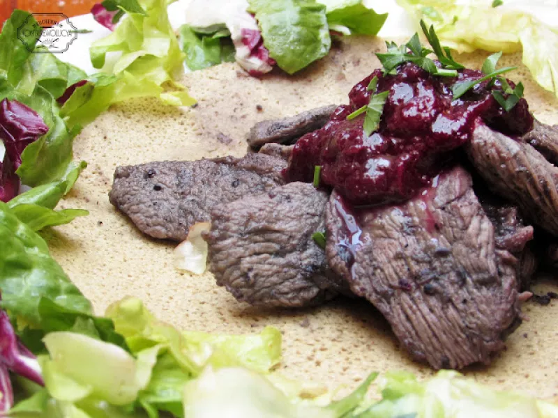 Mały obiad, duża przekąska... na każdą porę dnia, pyszna gorąca kaczka. :) Smażona bez tłuszczu, podana na gryczanym wytrawnym naleśniku z konfiturą rabarbarowo-porzeczkową.
