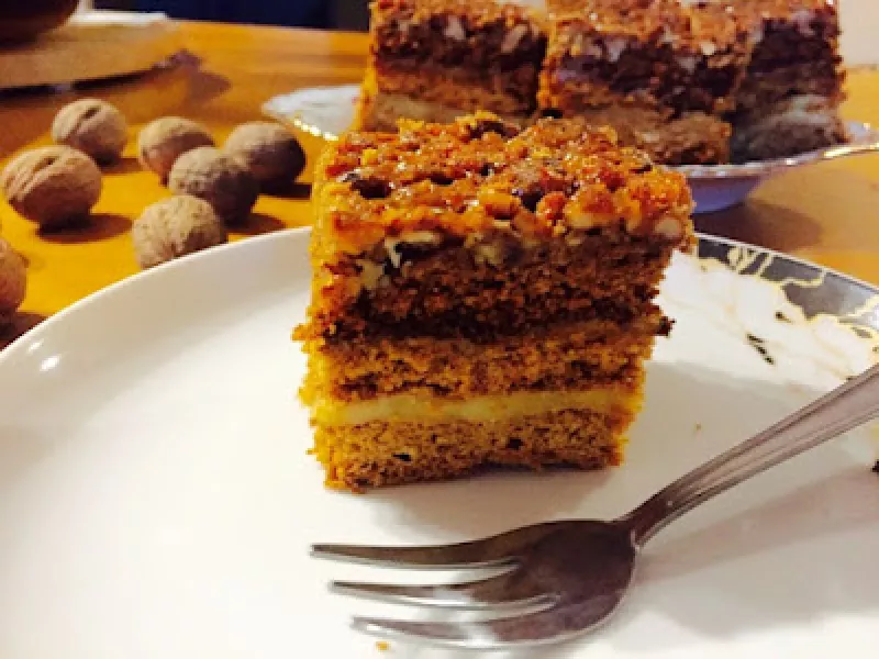 Do świąt jeszcze daleko, ale na smaczne ciasto zawsze jest pora. Moją ulubioną częścią jest warstwa orzechowa z karmelem domowej roboty. Składniki na blachę o wymiarach 36x25: - 600g mąki - 150g cukru - 2 jajka - 2 żółtka - 200g masła - 3 łyżki mleka - 4 łyżki miodu - 2 łyżeczki sody oczyszczonej Przełożenie: - 1 opakowanie budyniu śmietankowego - 1 puszka skondensowanego mleka Warstwa orzechowa: - 125g masła - 4 łyżki cukru - 2 łyżki miodu - 200g posiekanych orzechów włoskich Wykonanie...
