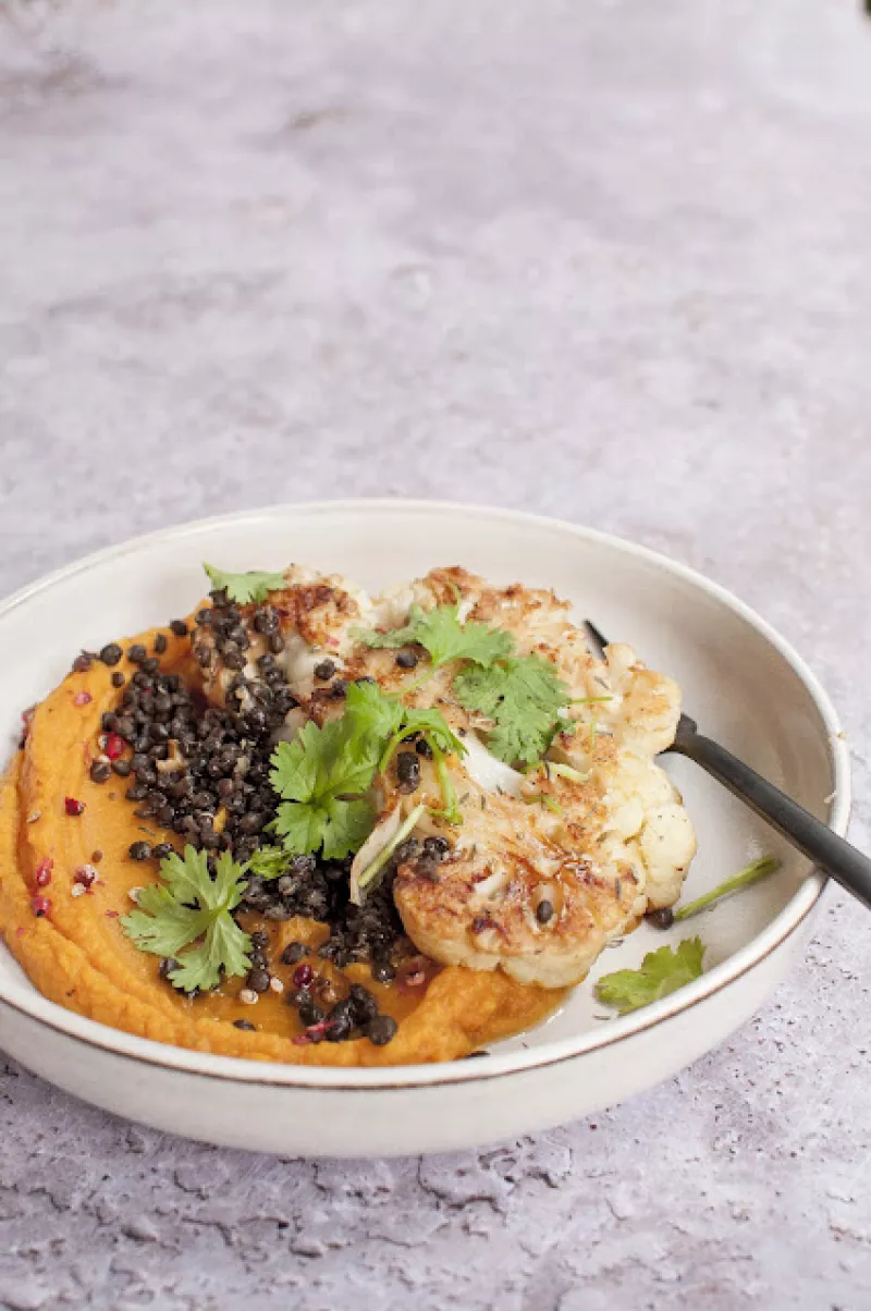 Stek z kalafiora z miso na puree z batatów i czarną soczewicą to roślinny talerz pełen smaku.Zainspirowałam się daniem na Pinterest, ale nie było do niego przepisu. To danie to dowód na to, że kuchnia roślinna potrafi być zarówno sycąca, jak i wyrafinowana. Na zdjęciu widzicie: steka z kalafiora, upieczonego z pastą miso, która nadaje mu głębokiego smaku umami.Aksamitne puree z batatów, lekko słodkie, kremowe i doskonale kontrastujące ze słonością kalafiora i z czarną soczewicą beluga, która ...