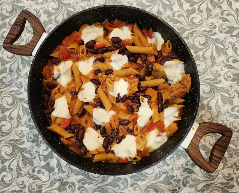Uwielbiam dania doprawione na włoską nutę z parmezanem,mozzarellą, oregano i bazylią. Zapraszam na taki makaron ( oczywiście pełnoziarnisty,żeby było zdrowo)w wersji wegańskiej, bo zamiast piersi z kurczaka, którą zazwyczaj dodaję do tego typu dań, dodałam kotlety sojowe. Wyszło smacznie, bardzo sycąco i jak to u mnie zwykle bywa ekspresowo:)Składniki na 4 porcje:30 g kotletów sojowych 150 g ciemnego makaronu200 g czerwonej fasolki z puszki400 g pomidorów krojonych z puszki1 średnia cebula1 ...