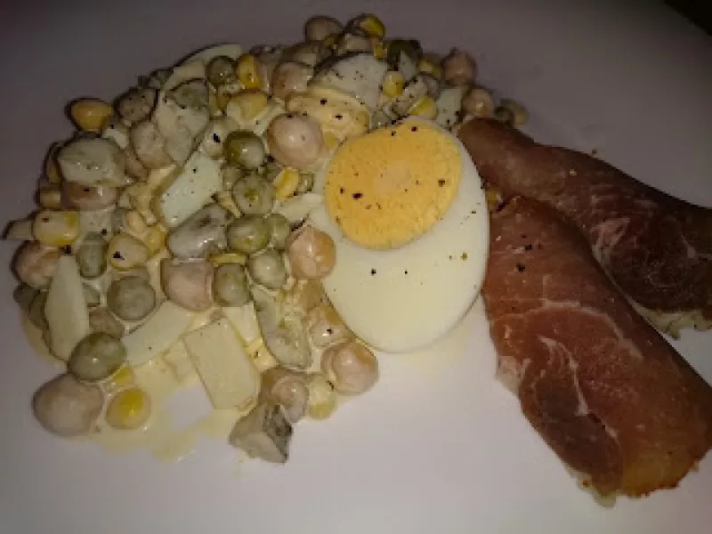 sałatka warzywna z szynką Jet to jedna z najprostszych i najszybszych w wykonaniu sałatek. A mimo to jej smak jest wręcz wyborny. składniki dla czterech osób 5 jajek 3 konserwowe ogórki 200 g ciecierzycy z puszki 200 g kukurydzy z puszki 200 g groszku z puszki 100 g szynki ( ja użyłem obsuszanego wyrobu domowego ale możemy również użyć szynki wędzonej ze sklepu) 2 łyżki majonezu 4 łyżki jogurtu 1 łyżeczka ostrej musztardy 1/2 pęczku szczypiorku sól, pieprz sposób przygotowania Jajka gotuje...
