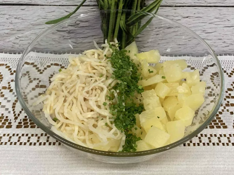 Ta sałatka to połączenie słodyczy ananasa i charakterystycznego smaku selera konserwowego. Całość przełamuje lekki sos jogurtowo-majonezowy, a świeży szczypiorek dodaje aromatu. Zrobisz ją w kilka minut, zaledwie z kilku składników. Prosta, chrupiąca i orzezwiająca. Świetna jako dodatek do obiadu, grillowanych dań albo szybka przekąska. Składniki 1 słoik selera konserwowego 1 puszka ananasa (kawałki lub plastry) 1 pęczek szczypiorku 2–3 łyżki jogurtu naturalnego 1 łyżka majonezu 1 łyżeczka ol...