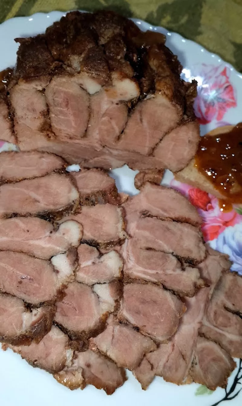 Składniki: karkówka bez kości 1 kg, ziele angielskie 4 sztuki, liście laurowe 2 sztuki, cebula 6 sztuk mniejsze, woda 3 szklanki marynata: pieprz mielony 1 łyżeczka, papryka słodka 1 łyżeczka, kucharek 1 łyżeczka, przyprawa w płynie 1 łyżeczka, sól 1 łyżeczka, czosnek granulowany 1 łyżeczka, papryka ostra 1/2 łyżeczki, dżem śliwkowy 3 łyżki, olej rzepakowy 1/4 szklanki Wszystkie składniki na marynatę w misce dobrze wymieszać. Karkówkę opłukać i osuszyć ręcznikiem papierowym, karkówkę ponac...