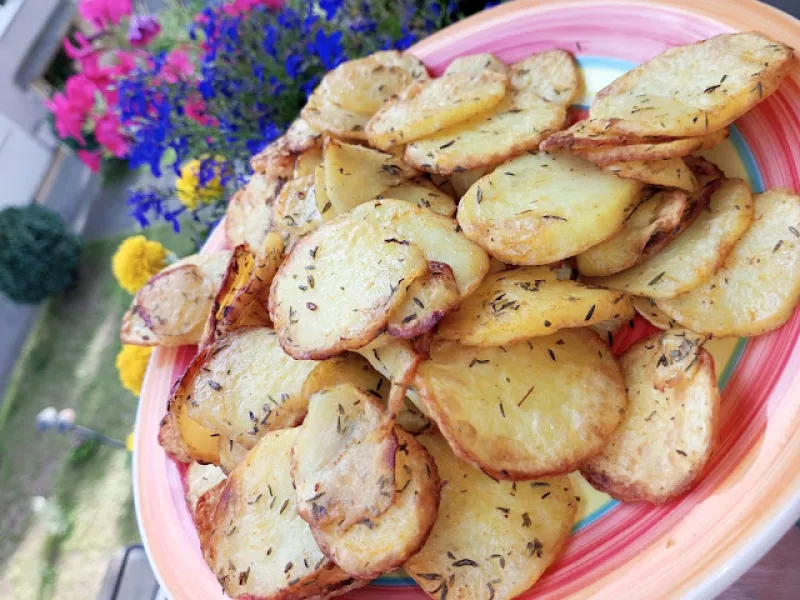 Składniki: recipe:📣📣📣 ziemniaki około 1 kg, olej rzepakowy 3 lyżki, tymianek suszony 1 łyżka, papryka słodka 1 łyżeczka, sól 3/4 łyżeczki, przyprawa do ziemniaków pikantna 1 łyżka 🆗 Obrane ziemniaki pokroić w cienkie plasterki do miski, zalać zimną wodą na 15 minut 🆗 Wylać na durszlak i dobrze odcedzić z wody i na ręczniku papierowym osuszyć 🆗 Wsypać do miski ziemniaki i pozostałe składniki, wymieszać i wsypać do kosza airfryera 🆗 Ustawić program frytki, po sygnale wyjąć kosz, potrząsn...