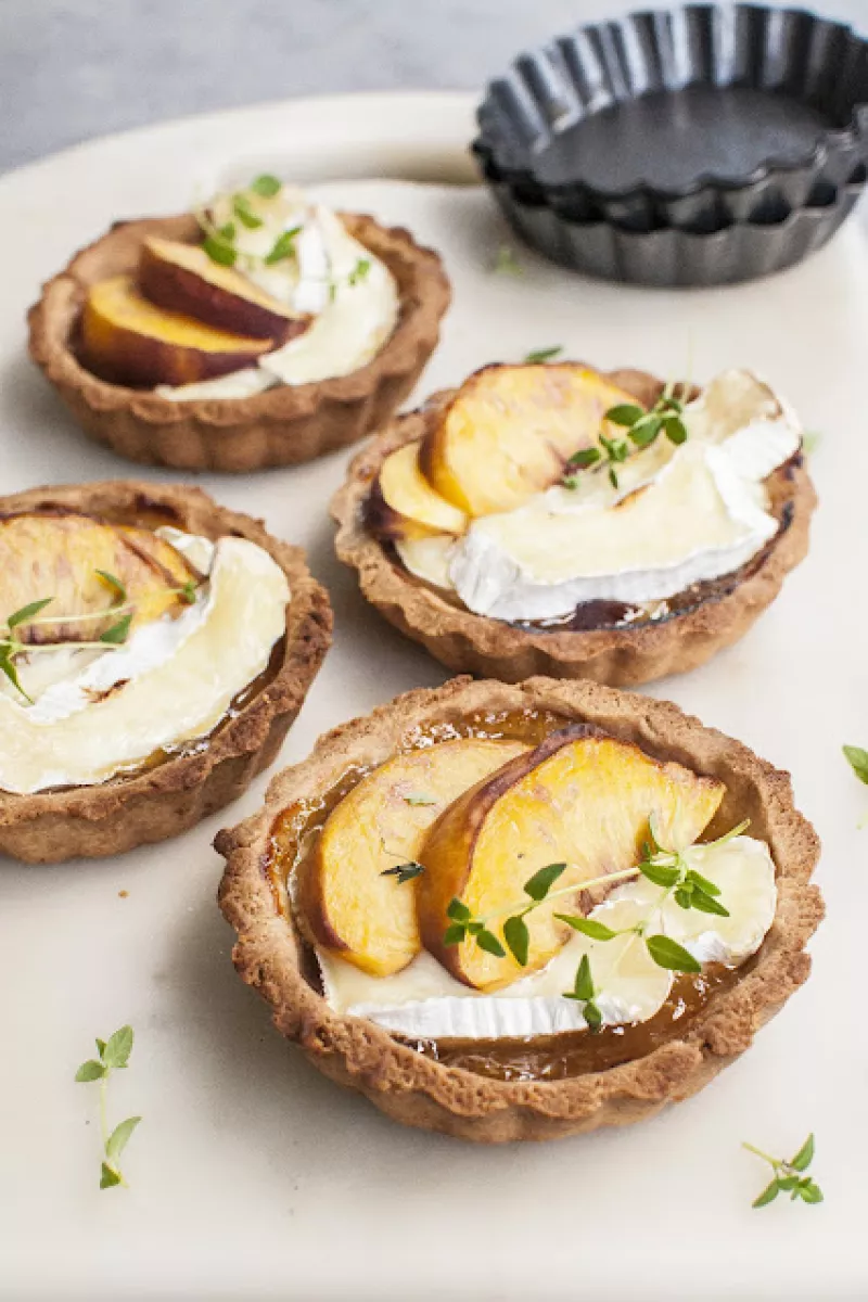 Kruche tartaletki wypełnione konfiturą z fig z pleśniowym serem i brzoskwinią zapieczone smakują niesamowicie. To słodko słony balans smaków. Idealne na deser lub jako przystawka. SKŁADNIKI:1 ser camembert (dałam okrągły bez laktozy)1 dojrzała brzoskwiniaCiasto:80 g zimnego masła pokrojonego na małe kawałki +do wysmarowania foremek 200 g mąki orkiszowej typ 550 żółtko1/3 łyżeczki soli1 łyżka zimnego jogutu lub śmietany 1/3 łyżeczki proszku do pieczeniaDodatkowo:kilka łyżeczek konfitury figow...