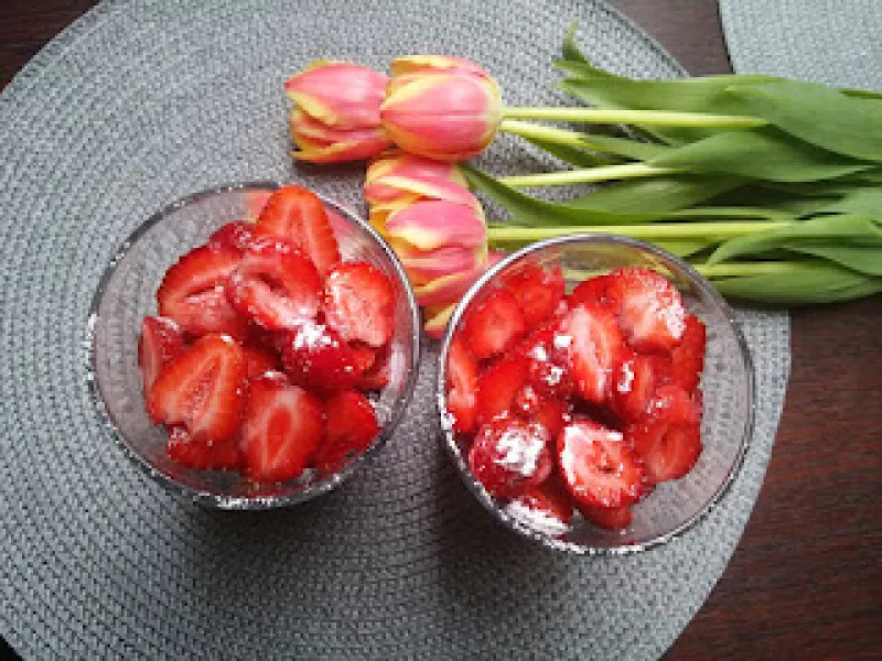 Lato pachnie truskawkami - to pierwsze co kojarzy mi się z tą porą roku. Za truskawkami nadchodzą pozostałe owoce, ale to te czerwone pyszności jako pierwsze zwiastują dni pełne słońca, długich spacerów i leniwych spojrzeń znad miseczek wypełnionych smakami. Truskawki z cukrem, same, krojone, w całości, z bitą śmietaną i wiórkami czekoladowymi - a nawet z lodami. To wszystko już było. Dzisiaj przedstawiam Wam deser szybki w wykonaniu, ale na tyle elegancki że możecie podać go na letnim party ...