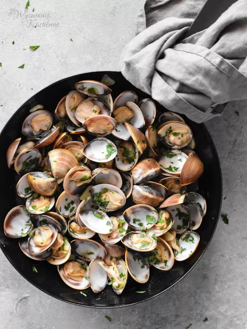 Klasyczny włoski przepis. Delikatne w smaku vongole, które polecam zjeść z chrupiącą bagietką.Składniki na 2 porcje:1 kg vongoli2 ząbki czosnkuoliwa z oliwek100 ml białego wytrawnego winapęczek natki pietruszkiVongole namoczyć w lekko osolonej wodzie przez 30 minut, opłukać pod bieżącą wodą a otwarte wyrzucić.Czosnek drobno posiekać lub pokroić na cienkie plasterki. Natkę posiekać.Na patelni rozgrzać 3 łyżki oliwy, dodać czosnek. Po kilku sekundach wlać białe wino i wrzucić vongole. Gotować n...