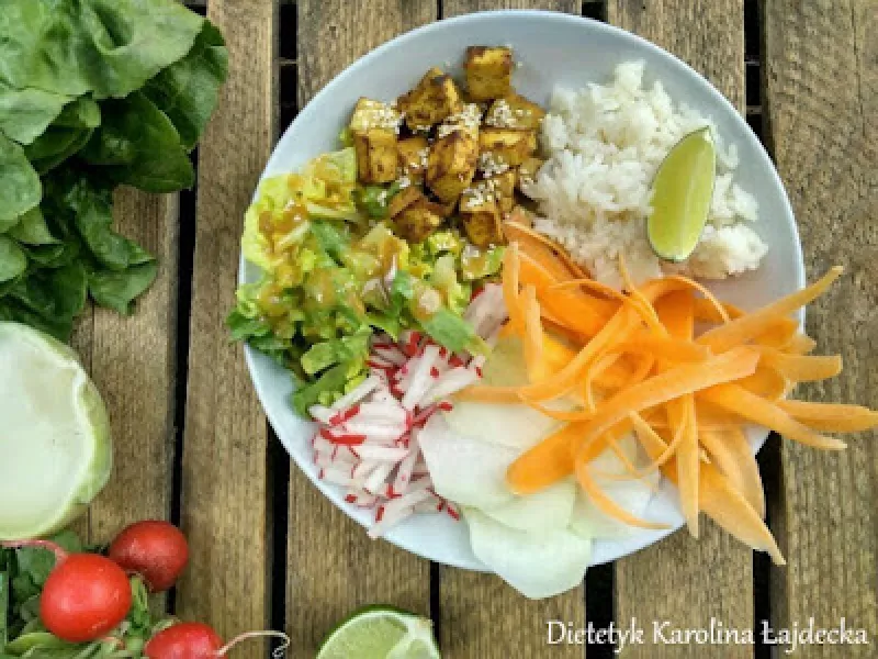 Składniki (na 1 porcję) - marchew (ok. 105 g), - pół kalarepy (ok. 102 g), - 4 rzodkiewki (ok. 80 g), - kilka liści sałaty rzymskiej (ok. 28 g), - łyżeczka oliwy z oliwek (ok. 5 g), - łyżeczka masła orzechowego (ok. 10 g), - pół łyżeczki miodu (ok. 6 g), - łyżka soku z cytryny (ok. 5 ml), - 1/3 woreczka ryżu (ok. 33 g), - pół opakowania tofu (ok. 90 g), - łyżeczka oleju (ok. 5 g), - łyżka sezamu (ok. 5 g), - przyprawy: sos sojowy, kurkuma, słodka papryka, ostra papryka i pieprz. Sposób przygo...