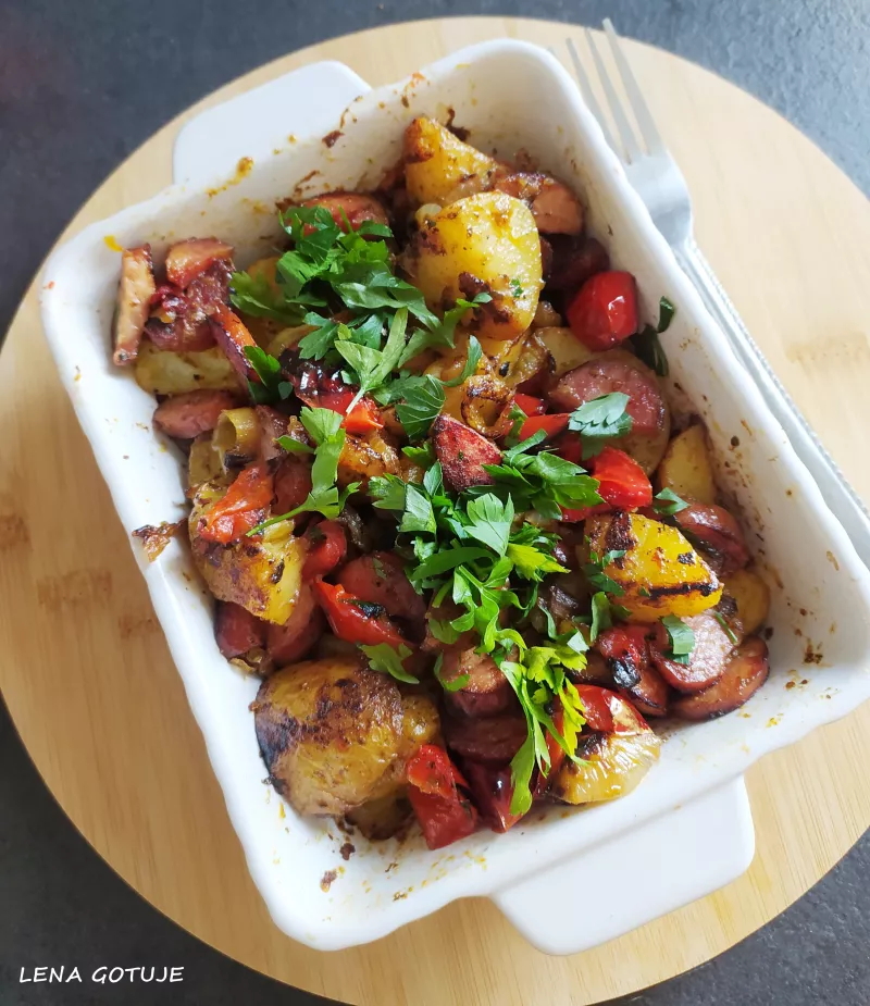 Zapiekanka z ziemniakami, kiełbasą i papryką