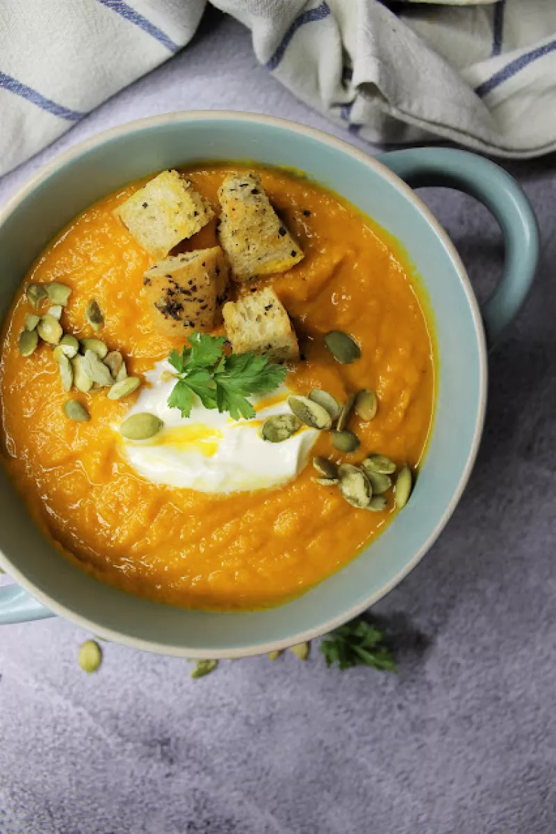 Składniki:1/2 małej dyni np. Hokkaido (ok. 500 g)2 marchewki1 cebula pokrojona w plasterki 2 ząbki czosnku2 szklanki (500 ml) bulionu warzywnego lub drobiowego Sól, pieprz, kurkuma, imbir i papryka chilliPrzygotowanie:Usuń miąższ z dyni i pokrój w kostkę. Marchewki obierz i pokrój w kostkę W wysokim garnku delikatnie podsmaż cebulę z czosnkiem. Dodaj dynię oraz marchewkę i podsmaż około 3 minuty na średnim ogniu. Wlej bulion, dopraw i gotuj około 20 minut (co jakiś czas mieszaj).Jeżeli warz...