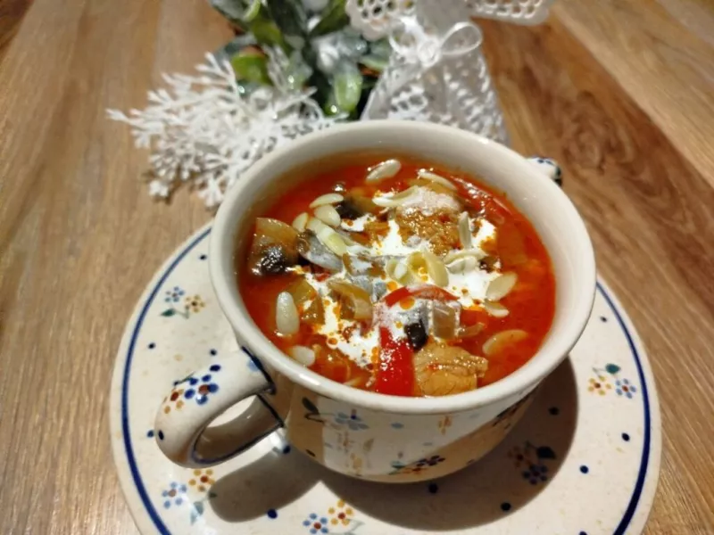 Zupa z kurczakiem z dodatkiem pieczarek i papryki która rozgrzewa, syci i aż prosi o robienie częściej i więcej. Idealnie sprawdzi się na każdą okazję od święta czy w zwykły dzień. Nie wymaga wiele czasu na przygotowanie, a smakuje wyśmienicie. Składniki: 1 podwójna pierś z kurczaka500g pieczarek2 średnie szpiczaste papryki1 średnia cebula1-2 łyżki koncentratu pomidorowego2 litry bulionu drobiowego lub warzywnegoolejsólpieprzpapryka ostra Dodatkowo: makaron do podania (kształt jaki lubicie)śm...